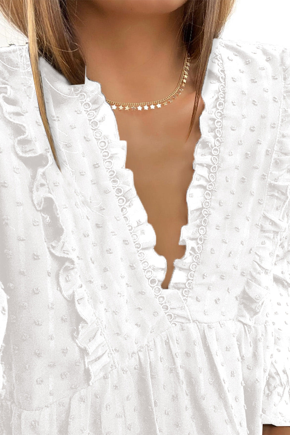•Ruffled v neckline is very chic and perfect to show wearer’s charm
